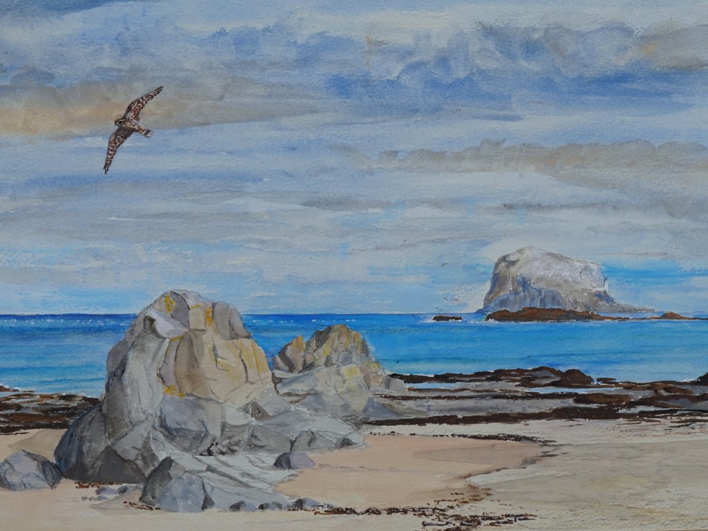 It was a winter’s day in East Lothian but fine enough for a stroll along the shore at North Berwick. The merlin in the picture caught my eye as he pursued a rock pipit. It came out of the blue. He didn’t catch the wee bird but nonetheless I thought he should put in an appearance in the composition.