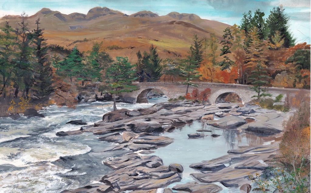 Anyway, it's higher than usual water that we have here. I think gouache is just the job the make the late-season colours of trees and mountains good and solid. I’ve applied it with brushes and an old toothbrush. I’ve got the original (offers, anyone?) in a gold-coloured frame and it looks just fine, bringing out the reddish tints of an autumn visit to this charming Highland spot. You might want to treat your print in the same way…only a suggestion, mind…